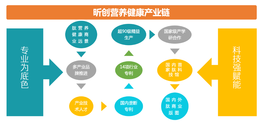 昕創(chuàng)食品擁有自己的“免疫力”品牌夢想,其以“快抗”切入“抵抗力市場”,同時設(shè)置多個品牌,以“肽營養(yǎng)健康”為商業(yè)遠景,肽產(chǎn)品研發(fā)、肽營養(yǎng)補充并進,點亮國內(nèi)壟斷專利、14項行業(yè)專利,并建立超90級精益生產(chǎn)線、推行國家級產(chǎn)學(xué)研合作,由此,建立健全昕創(chuàng)營養(yǎng)健康產(chǎn)業(yè)鏈。