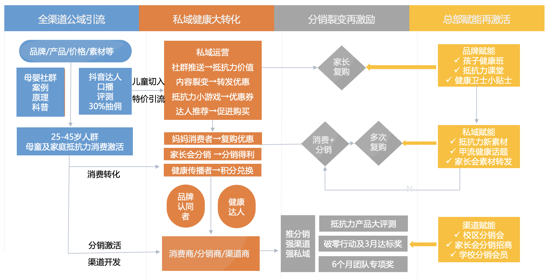——對于年輕消費者,以“媽媽群體”為切入人群,激活其對兒童抵抗力的關(guān)注度,首先產(chǎn)生“兒童抵抗力”產(chǎn)品的購買,其次關(guān)注“成人活力”的提升,擺脫身體乏力、活力不足等情況,全力提升新產(chǎn)品價值。