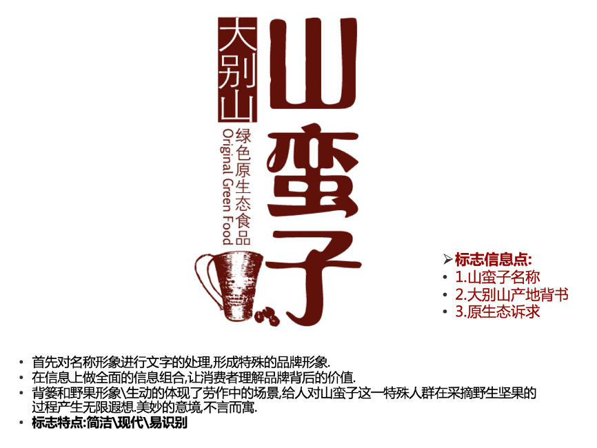 經(jīng)過(guò)與大別山生態(tài)農(nóng)業(yè)的深度溝通,高層對(duì)集團(tuán)層面的“企業(yè)LOGO”標(biāo)識(shí)已經(jīng)有想法了,項(xiàng)目組在“承接高層意志”的基礎(chǔ)上點(diǎn)亮了品牌核心價(jià)值,建議其圍繞“大別山”強(qiáng)化標(biāo)識(shí)認(rèn)知,強(qiáng)化“原生態(tài)”價(jià)值,取得了公司高層的一致認(rèn)可。