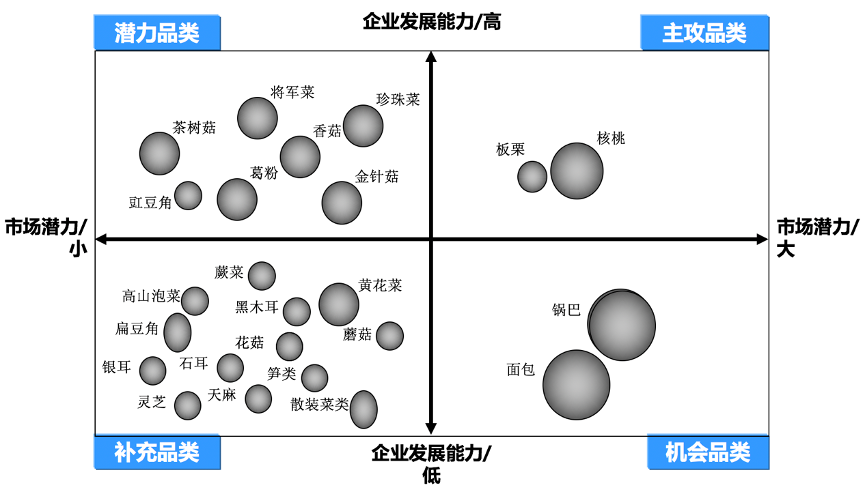 根據(jù)對(duì)食品市場(chǎng)潛力和大別山發(fā)展能力的綜合分析,項(xiàng)目組建議大別山以板栗、核桃為主攻品類(lèi),山珍等為潛力品類(lèi),鍋巴、面包為機(jī)會(huì)品類(lèi),黃花菜、豆角等為補(bǔ)充品類(lèi)