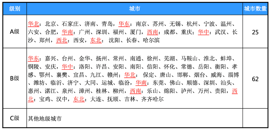 2)大別山食品將重點(diǎn)針對(duì)各區(qū)域的A、B級(jí)地市進(jìn)行招商,并根據(jù)地市級(jí)別作為招商政策、銷(xiāo)售人員薪酬等級(jí)評(píng)定和差旅標(biāo)準(zhǔn)上分類(lèi)確定的依據(jù)。
