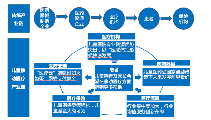 “兒科移動醫療三大態勢”之二:“泛兒科移動醫療”大整合。兒科醫療涉及到醫療、醫藥和器械等多領域的整合,涉及到患者自診、在線測評、到院預約、在院治療、出院護理等多個診療環節,部分重病患者還涉及到器械、康復等深度診療領域,領域跨度大、醫患交流多,兒科移動醫療行業具有戰略性發展機遇。