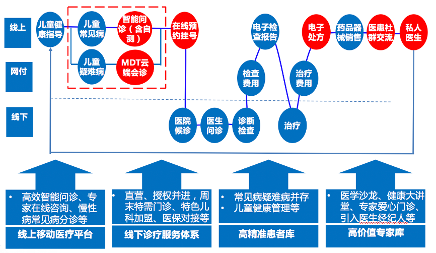 以青蘋果為代表的兒童專科醫療,發力移動醫療平臺領域,強化醫患在線溝通、微信公眾號預約、線下醫院導流等,匯聚兒科醫療資源,推動線上線下的O2O經營,活化兒科移動醫療服務。