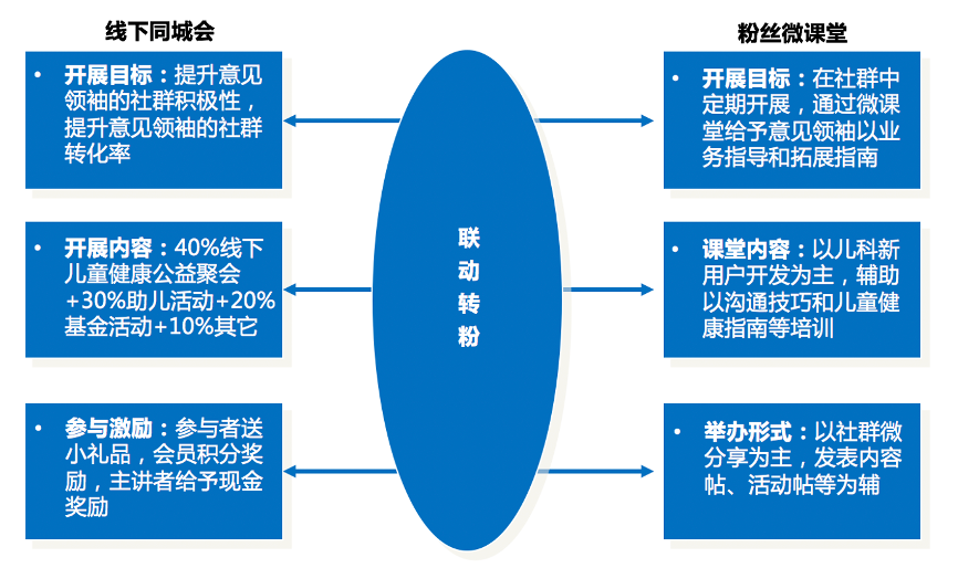 第三步:聯動轉粉。積極組建“線下同城會”,構建線上“兒科微課堂”,線上線下聯動,通過公益聚會、助兒活動、基金活動等強化線下同城聚會及患兒互動,以線上“兒科微課堂”強化兒科社群分享,通過發布內容帖、活動帖、課堂講座等提升患者認同感。