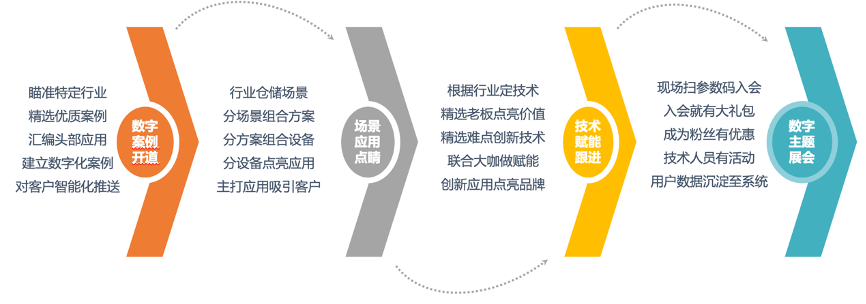 再次,“點(diǎn)亮傳播”。引入行業(yè)級(jí)、引領(lǐng)型技術(shù),打造“強(qiáng)技術(shù)背書(shū)”;構(gòu)建“智能倉(cāng)儲(chǔ)產(chǎn)業(yè)同盟”,提升產(chǎn)業(yè)品牌影響力;推動(dòng)標(biāo)志外露,實(shí)行伙伴的高激勵(lì);同時(shí)點(diǎn)亮線上云課堂、線下交付會(huì)等全渠道品牌體驗(yàn),通過(guò)“講案例+講場(chǎng)景+講技術(shù)”打造數(shù)字化展會(huì)。
