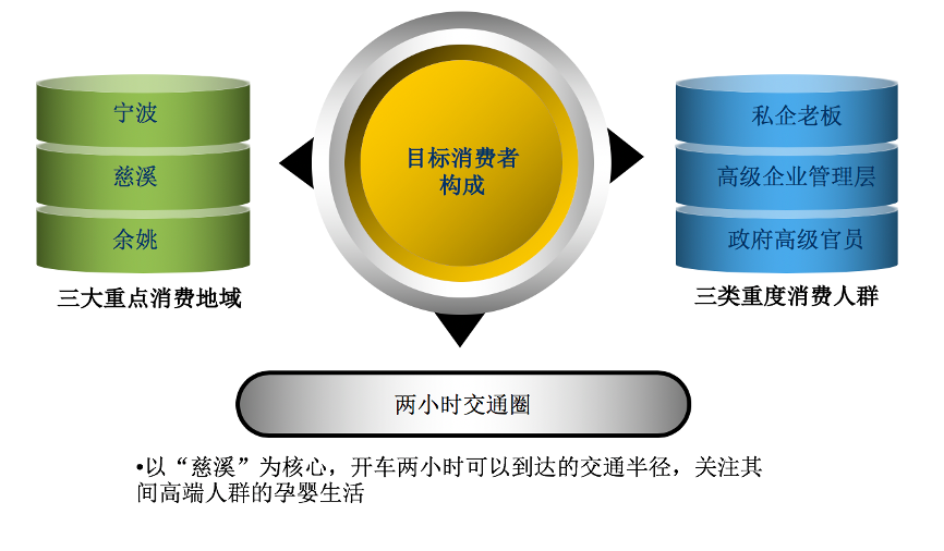 目標(biāo)消費(fèi)者構(gòu)成:以“兩小時交通圈”為核心,涵蓋寧波、慈溪、余姚等經(jīng)濟(jì)發(fā)達(dá)城市,主攻私企老板、高級企業(yè)管理層、政府高官“三類重度消費(fèi)人群