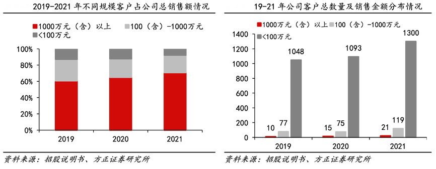 經(jīng)典案例:根據(jù)招股說明書、方正證券研究所等綜合資訊表明,從寶立食品客戶擴(kuò)展數(shù)量來看,其大客戶(年銷售額 1000 萬元及以上)年均拓展 5.5 家,大客戶數(shù)量呈逐年上升趨勢(shì),主要系公司基于對(duì)大客戶的服務(wù)能力及行業(yè)口碑,不斷拓展優(yōu)質(zhì)客戶的結(jié)果。該部分客戶銷售金額合計(jì)占公司主營(yíng)業(yè)務(wù)收入的比例較高,各期均超過60%,集中度較高。
