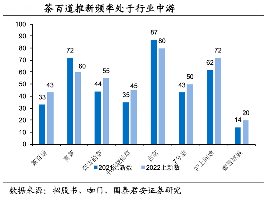 經典案例:根據招股書、咖門、國泰君安證券研究等綜合資訊表明,茶百道公司持續對消費者口味喜好的變化趨勢進行調研與預判,并結合挖掘區域特色水 果,持續探索新穎原料組合碰撞后產生的新風味,通過每隔幾個月即上新季節限定款或區域限定款產品的方式持續為消費者帶來新穎、驚喜的茶飲體驗。2023 年,茶百道開發出約 250 多款產品,并推出了 48 款新 品,升級了 13 款產品,飽受消費者好評。