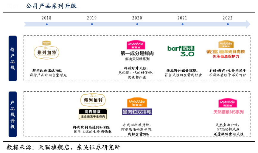 經(jīng)典案例:根據(jù)天貓旗艦店、東吳證券研究所等綜合資訊表明,乖寶寵物公司在 2015 年推出的牛肉雙拼糧市場反饋良好,因此公司不斷升級配方,推出鹿肉雙拼糧、黑肉粒雙拼糧等。雙管齊下的配方優(yōu)化可提升公司整體產(chǎn)品品質(zhì),實(shí)現(xiàn)品牌調(diào)性升級。