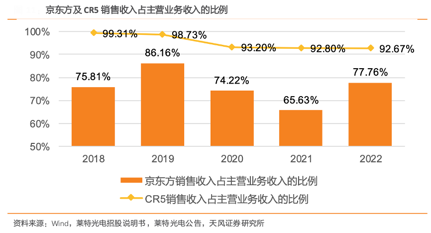 經典案例:根據wind、萊特光電招股說明書、萊特光電公告、天風證券研究所等綜合資訊表明,自 2018 年至 2022 年,京東方得益于其在 OLED 小尺寸顯示面板領域所擁有的全球第二、 國內領先的顯著市場優勢,始終占據公司核心客戶的地位。同時,公司前五大客戶(CR5)的銷售占比至 2022 年,這一 集中度依然高達 92.67%,反映了公司客戶結構相對集中的現狀。