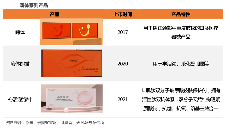 經典案例:根據新氧、愛美客官網、鳳凰網、天風證券研究所等綜合資訊表明,愛美客嗨體系列立足市場空缺( 頸紋)或 稀缺性( 眼周 /合規 水光)領 域,差異化推新相繼上市嗨體、嗨體熊貓、冭活泡泡針產品,該系列產品主要由透明質酸鈉、L-肌肽、甘氨酸、丙氨酸、脯氨酸、維生素 B2 和注射用水組成,多組分在滋養的同時可通過提升成纖維細 胞膠原分泌能力達成祛皺緊致等功效。