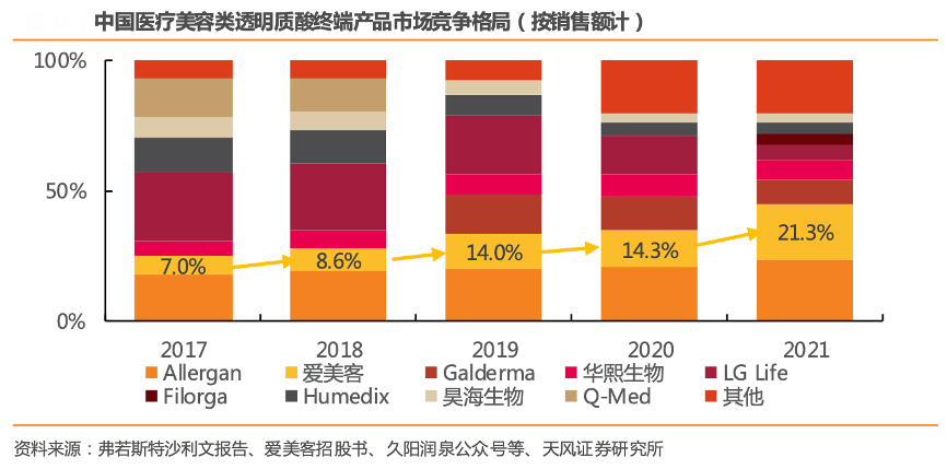 經(jīng)典案例:根據(jù)弗若斯特沙利文報(bào)告、愛美客招股書、久陽潤(rùn)泉公眾號(hào)、天風(fēng)證券研究所等綜合資訊表明,愛美客公司圍繞玻尿酸填充劑領(lǐng)域深耕,從逸 美開始 不 斷擴(kuò)充產(chǎn)品矩陣、改善注射感受(愛芙萊),并伴隨產(chǎn)品迭代升級(jí)(逸美→逸美一加一) 及適應(yīng)癥拓展(截止 23H1 逸美一加一正進(jìn)行新填充部分適應(yīng)癥臨床試驗(yàn))等等,產(chǎn)品合規(guī)化、豐富度及差異化優(yōu)勢(shì)明顯,市占率持續(xù)提升。弗若斯特沙利文數(shù)據(jù)顯示,2021 年國(guó)內(nèi)透明質(zhì)酸醫(yī)美終端 市場(chǎng)本土頭部三品牌銷售額占比 32.8%,其中公司市場(chǎng)份額提升最為明顯,按銷售額計(jì)市 占率已從 2017 年的 7.0%提升到了 2021 年的 21.3%。