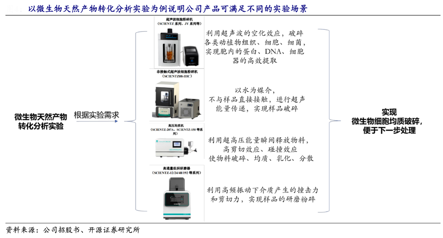 經典案例:根據公司招股書、開源證券研究所等綜合資訊表明,新芝生物公司產品鏈比較完整,可應用于組織、細胞、微生物、病毒、生物大分子和生物小分子轉化處理培養等實驗,滿足不同實驗需求和應用場景。例如進行微生物天 然產物轉化分析實驗時,可根據實驗需求選擇公司的超聲波細胞粉碎機、非接觸式 超聲粉碎機、高通量組織研磨儀、高壓均質機等儀器進行微生物細胞的均質破碎。