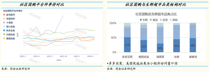 經(jīng)典案例:根據(jù)國(guó)金證券研究所等綜合資訊表明,2020年8月拼多多公司推出多多買菜業(yè)務(wù),截至目前多多買菜市場(chǎng)份額達(dá)到42%,龍頭優(yōu)勢(shì)明顯。公司傳統(tǒng)優(yōu)勢(shì)品類-生鮮農(nóng)產(chǎn)品(果蔬肉蛋)是主要的銷售來(lái)源。從多多買菜小程序的品 類訪問(wèn)結(jié)構(gòu)來(lái)看,蔬菜/水果/肉蛋占比近一半。生鮮平均單價(jià)低于標(biāo)品及百貨,預(yù)計(jì)低毛利的生鮮品類占比低于50%。