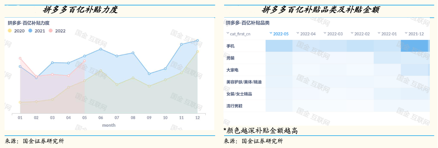 經(jīng)典案例:根據(jù)國(guó)金證券研究所等綜合資訊表明,2019年6月,拼多多公司推出百億補(bǔ)貼計(jì)劃,聯(lián)合品牌商家補(bǔ)貼上萬(wàn)款商品。補(bǔ)貼力度:2021年相比2020年補(bǔ)貼力度持續(xù)提升,2022 年 3 月至 5 月期間主要受疫情影響,可選品類的消費(fèi)需求走弱,商家補(bǔ)貼意愿和營(yíng)銷投放意愿降低。補(bǔ)貼品類方面,手機(jī)、家電、化妝品、服飾等為補(bǔ)貼的重點(diǎn)品類。