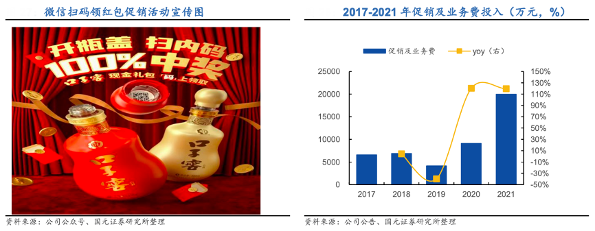 經(jīng)典案例:根據(jù)公司公眾號(hào)、公司公告、國(guó)元證券研究所等綜合資訊表明,2020年、2021年口子窖公司加大促銷及業(yè)務(wù)推廣投入,促銷及業(yè)務(wù)費(fèi)用連續(xù)兩年增速達(dá)到120%,尤其是在 2021 年第四季度消費(fèi)旺季加大投放力度。根據(jù)促銷活動(dòng)規(guī)則,消費(fèi)者只要通過(guò)微信掃碼,就有 100% 的機(jī)率領(lǐng)取現(xiàn)金紅包、累計(jì)積分、兌換禮品。一系列促銷活動(dòng)提高了消費(fèi)者積極性,活躍了終端市場(chǎng)。