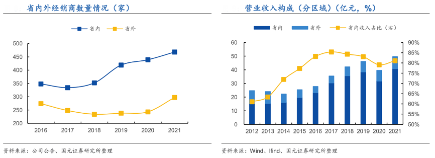 經(jīng)典案例:根據(jù)公司公告、wind、lfind、國(guó)元證券研究所等綜合資訊表明,口子窖穩(wěn)住省內(nèi)市場(chǎng)基本盤,加速省外重點(diǎn)地區(qū)市場(chǎng)開(kāi)拓。2016 年以來(lái),公司省內(nèi)收入穩(wěn)定在 8 成左右,2021年省內(nèi)收入 40.78 億元,其優(yōu)先集中資源發(fā)展省內(nèi)市場(chǎng),建立了穩(wěn)固的省內(nèi)基本盤。2016-21 年,省外收入占比及經(jīng)銷商數(shù)量呈先降后升趨勢(shì),近年來(lái)公司省外招商力度加大,產(chǎn)品在全國(guó)范圍的影響力提升。