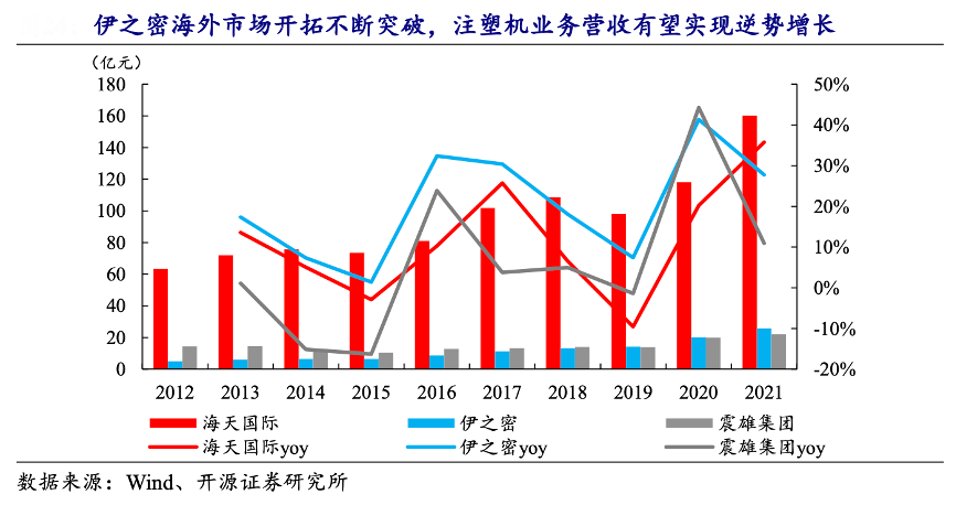 經(jīng)典案例:根據(jù)wind、開源證券研究所等綜合資訊表明,伊之密挑戰(zhàn)行業(yè)龍頭,瞄準(zhǔn)中高端市場。2019 年,公司注塑機(jī)業(yè)務(wù)營業(yè)收入首次超越震雄集團(tuán),近年來公司營收增速基本高于同行業(yè)內(nèi)主要競爭對手。2021年,海天國際注塑機(jī)業(yè)務(wù)營收在行業(yè)景氣度下行中逆勢增長,主要原因是海天國際的海外市場營收占比高于伊之密與震雄集團(tuán),