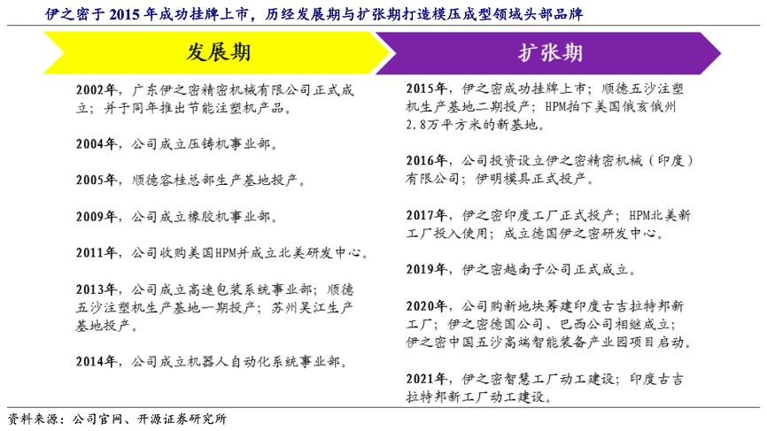 經(jīng)典案例:根據(jù)公司官網(wǎng)、開源證券研究所等綜合資訊表明,自伊之密公司于 2002 年成立以來,始終專注于模壓成型專用機(jī)械設(shè)備的設(shè)計、研發(fā)、生產(chǎn)、銷售及服務(wù),能夠為客戶提供從方案設(shè)計、產(chǎn)品制造到維修服務(wù)等全方位的個性化解決方案。