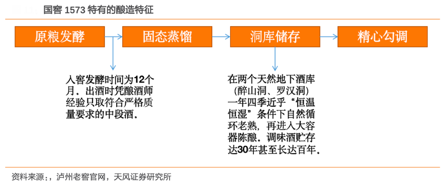經典案例:根據瀘州老窖官網、天風證券研究所等綜合資訊表明,1573國寶窖池的連續使用年齡至今已超400年,國窖1573中能夠定量的香味成分為163種,而只能定性卻無法定量的成分還有 200 多種。國窖 1573 的主要釀造過程為原糧發酵、固態蒸餾、洞庫貯存和精心勾調,一個完整的釀造過程耗時長達 30 年以上。