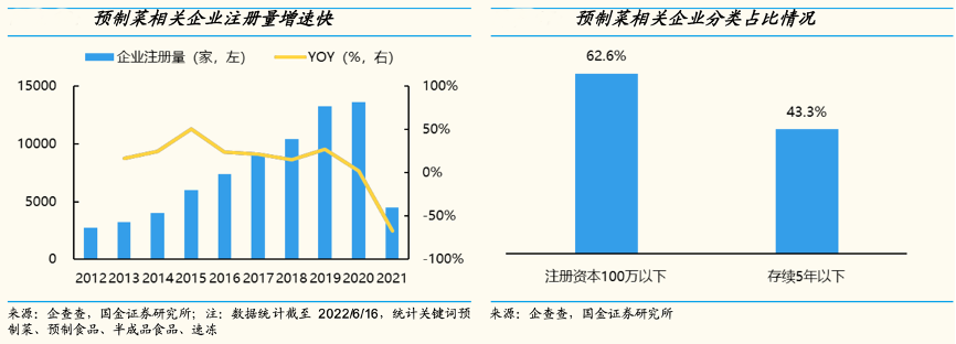 經(jīng)典案例:根據(jù)企查查、國金證券研究所等綜合資訊表明,近幾年預(yù)制菜相關(guān)企業(yè)注冊量增速高達(dá) 20% 以上,以中小規(guī)模企業(yè)為主,注冊資本 100 萬以下、存續(xù)五年以上的預(yù)制菜相關(guān)企業(yè)占比達(dá) 62.6%、43.3%,不少仍是個體工商戶和作坊式的生產(chǎn)加工模式,仍舊處于藍(lán)海競爭局面。