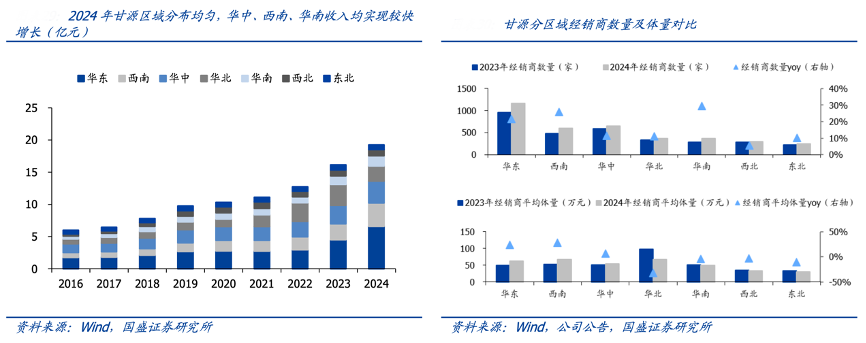 經典案例:根據wind、公司公告、國盛證券研究所等綜合資訊表明,甘源公司線下經銷團隊擴容,推動營收高增長。從區域來看,2024 年公司華東/西南/華中/華北/ 華南/西北/東北分別實現收入 6.6/3.7/3.4/2.3/1.6/1.0/0.7 億元,2020-2024 年 CAGR 分 別為 24.2%/21.9%/12.2%/18.5%/14.0%/1.3%/0.6%。