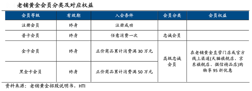 經(jīng)典案例:根據(jù)老鋪黃金招股說明書、HTI等綜合資訊表明,老鋪黃金顧客在注冊并完成首次購買后即可成為忠誠會員,享受包括終身免費基礎(chǔ)護理在內(nèi)的多項專屬售后服務;當累計消費達到 30 萬元及以上時,會員自動升級為“金卡會員”,達 50 萬元時則 晉升為“黑金卡會員”,金卡會員和黑金卡會員均可享受 5%購物折扣。公司通過積分 獎勵、定制化高單價產(chǎn)品及專屬禮遇等多樣化權(quán)益提升客戶體驗感與復購率。