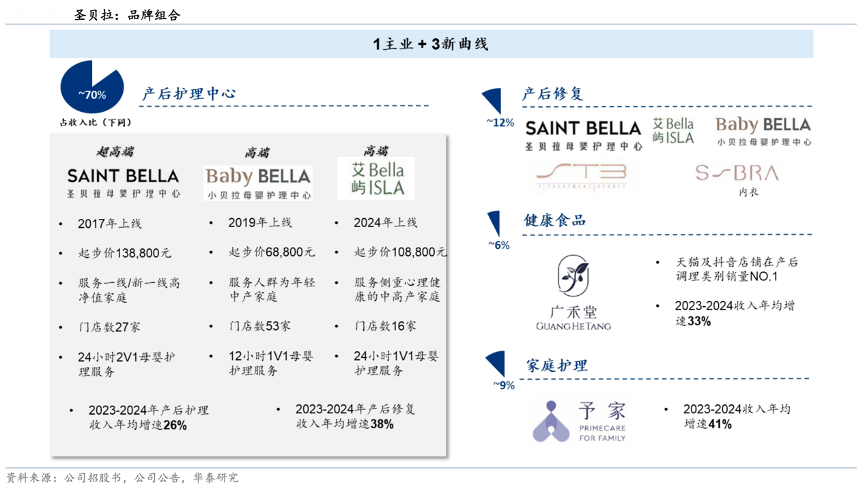經(jīng)典案例:根據(jù)公司招股書、華泰研究等綜合資訊表明,圣貝拉公司以月子中心為主業(yè),2024 年月子中心護理占收入 85%(含產(chǎn)后修復)。旗下包含 圣貝拉、小貝拉和艾嶼 3 個品牌,分別聚焦超高端需求、高端需求和女性心理健康月子護理賽道。